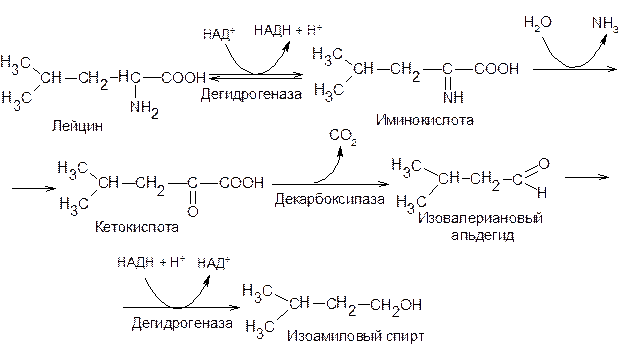Дегидрогеназа, отнимая от аминокислоты водород, передает его хинону, который при этом превращается в полифенол. Полифенол снова окисляется полифенолоксидазой с образованием воды и хинона, который опять может вступать в реакцию. Иминокислота, присоединяя воду, дает кетокислоту и аммиак. Окислительное дезаминирование аминокислот имеет большое положительное значение в ряде бродильных производств, основанных на использовании спиртового брожения. Именно в результате дезаминирования образуется целый ряд побочных продуктов спиртового брожения, оказывающих большое влияние на качество готовой продукции – спирта, вина, пива. При дезаминировании аминокислот дрожжами образуются кетокислоты, которые подвергаются в дальнейшем окислительно-восстановительным превращениям, в результате которых образуются так называемые сивушные масла – смесь различных одноатомных спиртов, – придающие неприятный запах и привкус этиловому спирту, вину или пиву. Так, лейцин в ходе последовательных реакций дезаминирования, декарбоксилирования и восстановления превращается в изоамиловый спирт. Универсальными для всех живых организмов являются реакции расщепления аминокислот, в которых не происходит прямого выделения аммиака, в то время как аминогруппа от аминокислоты переносится на a-кетокислоту. Эти реакции называют реакциями трансаминирования и протекают они при участии ферментов аминотрансфераз. Подробно – смотри реакции синтеза аминокислот (см. п.2).