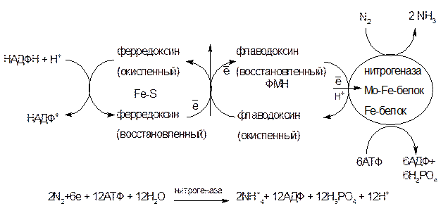 Для восстановления N2 в NH3 требуется 6 электронов и 6 протонов источником которых должен быть мощный восстановитель. Донором водорода для нитрогеназного комплекса является НАДФН+Н+. Для фиксации азота требуется также энергия в виде АТФ. На каждый перенесенный электрон затрачивается 1 молекула АТФ. Электроны переносятся к белкам нитрогеназы двумя различными типами белков – переносчиков электронов: ферредоксином (Fe –S белок) и флаводоксином (ФМН – содержащий белок). Превращение азота в аммиак можно представить следующей схемой: