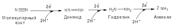 Для восстановления N2 в NH3 требуется 6 электронов и 6 протонов источником которых должен быть мощный восстановитель. Донором водорода для нитрогеназного комплекса является НАДФН+Н+. Для фиксации азота требуется также энергия в виде АТФ. На каждый перенесенный электрон затрачивается 1 молекула АТФ. Электроны переносятся к белкам нитрогеназы двумя различными типами белков – переносчиков электронов: ферредоксином (Fe –S белок) и флаводоксином (ФМН – содержащий белок). Превращение азота в аммиак можно представить следующей схемой: