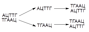Рисунок 2 – Схема репликации ДНК В данной схеме приведены лишь основные этапы репликации; в действительности этапов репликации значительно больше, в них участвуют специальные белки. В настоящее время установлено около десятка белков репликативного комплекса. Таким образом, благодаря принципу комплементарности полинуклеотидных цепей из одной исходной молекулы ДНК образуются две совершенно одинаковые, новые молекулы ДНК. Способность ДНК давать строго определенные, подобные себе, новые молекулы играют определяющую роль в явлениях наследственности и в передаче генетической информации от поколения к поколению. Другими словами, информация, записанная в ДНК (в генотипе), обеспечивает образование фенотипических признаков (окраска цветка, цвет волос, форма крыльев и т.д.) организма, трансформируется в фенотип. В 40-50-е годы это представление о связи между генотипом и фенотипом было экспериментально подтверждено на многих ферментах и других белках разных организмов; результаты нашли отражение в афористической формуле один ген – один белок. ДНК сосредоточена главным образом в ядре, синтез же белка происходит в другом месте (в рибосомах). Роль промежуточного переносчика информации от ДНК к месту синтеза белка выполняют рибонуклеиновые кислоты. Их роль в процессе биосинтеза белка различна. Направление потока информации в клетке от генотипа к фенотипу представляют так: ДНК ® РНК ® белки. транскрипция трансляция Иначе говоря, ДНК служит матрицей для синтеза всех РНК, а РНК – матрицей для синтеза белков. Это положение называют основным постулатом молекулярной биохимии. 3.2 Синтез РНК – транскрипция Содержание РНК во всех клетках живого организма непостоянно. Оно может меняться в зависимости от вида, возраста, физиологического состояния организма и ткани. Обычно в молодых клетках содержание РНК больше, чем в старых. Кроме того, в клетках содержатся различные по своим функциям и молекулярной массе виды РНК – рибосомная, транспортная и матричная. Все это обуславливает значительные трудности в изучении биосинтеза рибонуклеиновых кислот. Считают, что синтез РНК может происходить несколькими путями. Мы рассмотрим один из них, так называемый ДНК-зависимый синтез РНК. С точки зрения передачи наследственной информации в процессе биосинтеза белков, наибольшее значение имеет синтез молекул РНК на участке молекулы ДНК как на матрице. Исходными веществами, необходимыми для биосинтеза, являются рибонуклеозидтрифосфаты (АТФ, ГТФ, ЦТФ, УТФ); синтез катализируется ферментом РНК-полимеразой, сходной по своему действию с ДНК-полимеразой. Схема биосинтеза следующая: