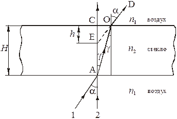 Для определения показателя преломления прозрачных сред существуют различные методы. Одним из них является метод определения показателя преломления стекла при помощи микроскопа. В основе метода лежит явление кажущегося уменьшения толщины стеклянной плоскопараллельной пластинки вследствие преломления проходящих сквозь нее световых лучей. Схема прохождения лучей света сквозь плоскопараллельную стеклянную пластинку дана на рис. 2.