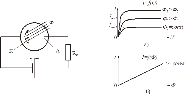 т.е. фотоэлектрон имеет нулевую кинетическую энергию. При меньшей частоте света n <n min энергии фотона не хватает, чтобы фотоэлектрон мог преодолеть потенциальный барьер и выйти из металла (3-й закон фотоэффекта). Для металла красная граница фотоэффекта Для большинства металлов красная граница фотоэффекта лежит в ультрафиолетовой (УФ) области спектра. У щелочных металлов она лежит в видимой и инфракрасной (ИК) областях спектра, поэтому они чувствительны к широкому диапазону длин световых волн. В измерительной, кино- и фототехнике, фотометрии используются фотоэлектронные приборы на внешнем фотоэффекте – фотоэлементы, фотоэлектронные умножители, электронно-оптические преобразователи. Простейший из них – вакуумный фотоэлемент. Вакуумный фотоэлемент представляет собой пустотный стеклянный или кварцевый баллон с двумя электродами – фотокатодом К и анодом А (рис. 1). Фотокатодом служит фоточувствительный слой из щелочных металлов (сурьмяно-цезиевый, кислородно-серебряно-цезиевый и др.), который наносится на металлический слой (подложку), предварительно осажденный на стекло, либо на металлическую пластину внутри баллона. Анод имеет вид металлического кольца или сетки. На катод подается отрицательный потенциал – «минус» источника питания, на анод – положительный. Падающий на фототокатод световой поток вызывает фотоэлектронную эмиссию (испускание электронов) с поверхности катода, а электрическое поле направляет вылетающие электроны к аноду, образуя ток в цепи.