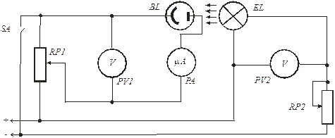 Основные характеристики фотоэлемента – вольтамперная характеристика I = f (U) при Ф =const и световая I = f (Ф) при U =const. Из вольтамперной характеристики I = f (U) (рис. 2 а) видно, что при неизменном световом потоке Ф фототок I зависит от напряжения U между катодом и анодом. Хотя число электронов, эмитированных с фотокатода в единицу времени, постоянно (Ф= сonst), при низких напряжениях U только небольшая часть фотоэлектронов попадает на анод. С ростом анодного напряжения все большее число электронов достигает анода и ток увеличивается почти линейно. Начиная с некоторого значения анодного напряжения все фотоэлектроны попадают на анод и наступает состояние насыщения, при котором сила тока равна I нас. Режим насыщения является рабочим режимом фотоэлемента. При увеличении светового потока Ф ток насыщения увеличивается, т. к. увеличивается число фотоэлектронов в единицу времени. Из световой характеристики I = f (Ф) (рис. 2 б) следует, что при неизменном анодном напряжении U ток I пропорционален световому потоку Ф: чем больше световой поток, тем большее число фотонов попадает на фотокатод, выбивая большее число электронов, которые и увеличивают фототок. Основными параметрами фотоэлемента являются квантовый выход g, световая чувствительность S ф, спектральная чувствительность S l. Квантовый выход g есть число эмитированных фотоэлектронов, приходящихся на каждый из падающих на фотокатод фотонов. Величина фототока насыщения, отнесенная к световому потоку в один люмен (лм) при номинальном анодном напряжении, называется световой чувствительностью фотоэлемента Более высокую чувствительность имеют газонаполненные (инертным газом) фотоэлементы. В них эмитированные катодом фотоэлектроны при движении к аноду ионизируют молекулы инертного газа, благодаря чему к аноду движется все более нарастающая лавина электронов. Однако их работа нестабильна и световая характеристика нелинейна, что сильно ограничивает использование. В настоящее время наиболее широкое применение имеют полупроводниковые фотоэлектронные устройства на внутреннем фотоэффекте в силу своей миниатюрности, низкого напряжения питания, высокой экономичности, надежности, длительного срока службы, низкой стоимости, которые применяются в системах сбора, передачи, обработки и отображения информации. В лабораторной работе исследуются характеристики вакуумного фотоэлемента. Исследование проводится при помощи установки, состоящей из оптической скамьи с масштабной линейкой, на которой расположен вакуумный фотоэлемент и эталонная лампа-осветитель. На рис. 3 EL - эталонная лампа-осветитель, BL – исследуемый фотоэлемент; PA – микроамперметр для измерения фототока; RP1 – потен циометр, регулирующий анодное напряжение, измеряемое вольтметром PV1. Реостат RP2 служит для установления напряжения на эталонной лампе–осветителе, измеряемого вольтметром PV2.