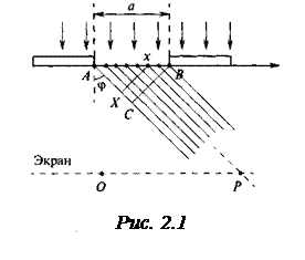 Пусть на бесконечно длинную щель падает плоская световая волна. В соответствии с принципом Гюйгенса-Френеля освещенную щель можно рассматривать как множество точечных когерентных источников волн. Поместим за щелью экран, расстояние до которого достаточно велико по сравнению с шириной щели. Это условие означает, что в данную точку Р экрана попадет параллельный пучок лучей, отклонившийся на угол φ (рис. 2.1). Оптическая разность хода АС=Δ крайних лучей из этого пучка определяется из треугольника ABC (