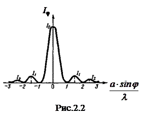 Соображения, приводящие к выражениям (2.3) и (2.5), имеют, вообще говоря, приближенный характер, поскольку мы применили метод зон Френеля для бесконечно удаленных точек наблюдения, рассматривая дифракцию в параллельных лучах, однако условие минимумов (2.3) оказывается точным. Что же касается «центральной» точки О экрана, расположенной против центра щели, то в нее попадает пучок неотклонённых лучей, ортогональных щели. Все они имеют одинаковую фазу, т. е. должны усиливать друг друга. Поэтому в условии минимумов (2.3) исключено значение m =0, соответствующее точке О. Значение m =0 исключено и из условия максимумов (2.5), поскольку этот максимум должен был бы расположиться между центральным максимумом и первым минимумом, что невозможно. Точные расчёты показывают, что при наложении всех вторичных волн, идущих под углом j от каждой точки щели, с учётом их амплитуд и фаз, амплитуда результирующего колебания имеет вид:
