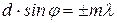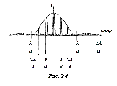 Это формула для главных максимумов при дифракции на дифракционной решетке. Кроме того, в тех направлениях, в которых ни одна из щелей не распространяет свет, он не будет распространяться и при двух щелях, т. е. главные минимумы при дифракции на решетке будут наблюдаться в направлениях, определяемых условием (2.3) для одной щели: