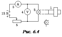 Используемая в работе установка (рис.6.4) состоит из пирометра 1, лампы накаливания 2, амперметра 3, вольтметра 4, реостата 5, источника постоянного напряжения 12 В. Основной частью установки является пирометр с исчезающей нитью, при помощи которого определяется температура нити накаливания.