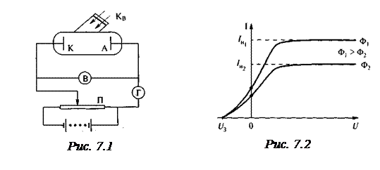 Одним из явлений, подтверждающих гипотезу фотонов, является фотоэлектрический эффект. Явление вырывания электронов с поверхности твёрдых и жидких тел под действием света (электромагнитного излучения) называется внешним фотоэффектом. Впервые явление фотоэффекта было открыто Г.Герцем в 1887г.: он заметил, что при освещении ультрафиолетовыми лучами металлическое тело теряет электроны. Первые количественные исследования фотоэффекта сделал А.Г.Столетов, который установил основные законы фотоэффекта. Позже установка Столетова была усовершенствована Ф.Э.А.Ленардом (рис. 7.1).