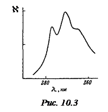 Твёрдые тела, жидкости и газы при высоких давлениях дают широкие полосы поглощения (на рис.10.3 представлен спектр раствора фенола). По мере повышения давления газов максимумы поглощения, первоначально очень узкие, всё более расширяются, и при высоких давлениях спектр поглощения газов приближается к спектрам поглощения жидкостей. Этот факт указывает на то, что расширение полос поглощения есть результат взаимодействия атомов (или молекул) друг с другом. Металлы практически непрозрачны для света. Это обусловлено наличием в металлах свободных электронов. Под действием электрического поля световой волны свободные электроны приходят в движение – в металле возникают быстропеременные токи, сопровождающиеся выделением ленц-джоулева тепла. В результате энергия световой волны быстро уменьшается, превращаясь во внутреннюю энергию металла. В рамках элементарной электронной теории Лоренца удалось объяснить сам факт наличия полос поглощения, однако различие в интенсивностях полос в рамках классической теории объяснить не удаётся. В квантовой механике, как и в полуклассической теории Бора, излучение и поглощение квантов света происходит лишь с частотами, удовлетворяющими правилу частот Бора: переход атома из состояния n с энергией E n в состояние m с энергией E m сопровождающийся поглощением или излучением фотона с частотой