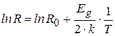 где Е g – ширина запрещенной зоны, k – постоянная Больцмана, R 0 – постоянная величина, характеризующая свойства полупроводника (R 0= R при Т→¥). Проведя логарифмирование (16.13), получим: