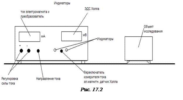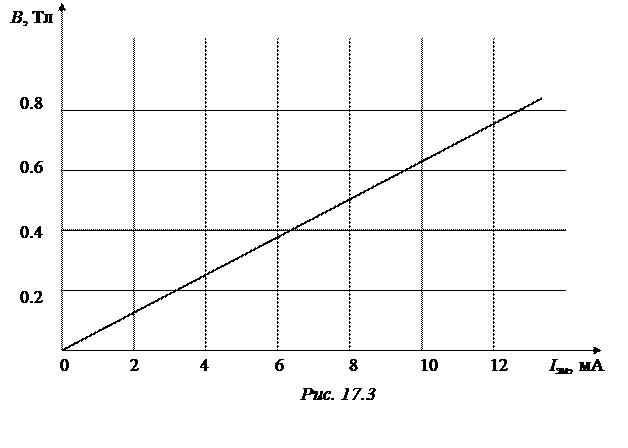 6. Установить полярность «+» переключателем «направление тока» (в индикации миллиамперметра отсутствует знак «–»). 7. Кнопками регулировки силы тока «+» и «–» установить силу тока электромагнита I эм=3 мА. 8. Измерить ЭДС Холла U +, записать все величины в таблицу 17.1. 9. Кнопками регулировки силы тока «+» и «–» устанавливать силу тока электромагнита I эм=4 мА; 5 мА; … 10 мА, каждый раз измеряя и записывая величину U +. 10. Установить полярность «–» переключателем «направление тока» (в индикации миллиамперметра присутствует знак «–»). 11. Повторить пункты 7-9, записывая в таблицу ЭДС Холла U – при другом направлении магнитного поля. 12. Повторить измерения ЭДС Холла для тока через датчик I =4 мА (пункты 2-11), а затем для I =5 мА. 13. По формуле (15.9) вычислите Холловскую разность потенциалов для каждого измерения. Результаты занесите в таблицу 17.1. U х=(U + – U –)/2. (17.12) 14. По графику (рис.17.3) зависимости В от I эм определите В и занесите в таблицу 17.1. 15. По формуле (17.9) рассчитайте R для каждого значения В, определяемого по току через электромагнит. 16. Вычислите среднее значение R. Таблица 17.1