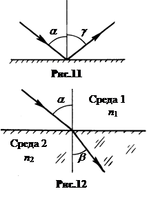 §4. Предмет геометрической оптики (ГО) 1. Предмет ГО. Раздел оптики, в котором изучаются законы распространения света на основе представлений о световых лучах, называется геометрической оптикой. Физически луч – это направление распространения энергии ЭМ волны в пространстве. Однако в том случае, когда размеры неоднородностей в оптических средах много больше длины волны света l, а протяженность световых лучей такова, что дифракционные явления практически отсутствуют, понятие светового луча абстрагируется к прямой линии. Таким образом, геометрическая оптика есть предельный случай реальной волновой оптики, соответствующий исчезающе малой длине световой волны по сравнению с размерами препятствий, отверстий, предметов и их изображений. ГО не рассматривает вопрос о природе света. Ее задача состоит в математическом исследовании хода световых лучей в оптических средах с заданным коэффициентом преломления n. Законы ГО позволяют создать упрощенную, но практически достаточно точную теорию оптических систем. Она объясняет, в основном, образование оптических изображений, дает возможность вычислить аберрации оптических систем и разрабатывать методы их исправления. Теория геометрической оптики была завершена в середине 17 века установлением принципа Ферма, из которого вытекали все известные к тому времени законы ГО. 2. Законы ГО. Они включают в себя 4 закона. Три первые из них были известны еще Евклиду (3 век до н.э.), а четвертый (закон преломления) был открыт в начале 17 века. a. б. Пересекающиеся лучи не возмущают друг друга. в. Угол отражения равен углу падения, а отраженный луч лежит в одной плоскости с падающим лучом и перпендикуляром, восстановленным в точку падения (закон отражения, рис.11), g = a. г. Отношение синуса угла падения луча на границе двух прозрачных сред к синусу угла преломления обратно пропорционально отношению абсолютных показателей преломления этих сред. Преломленный луч лежит в одной плоскости с падающим лучом и перпендикуляром, восстановленным в точку падения (закон преломления, Виллеброрд Снель, 1620, Рене Декарт, 1637, рис.12).
