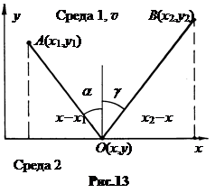 3. Принцип Ферма. В 1660 году Пьер Ферма сформулировал в виде аксиомы следующий принцип: время распространения светового луча от одной точки пространства к другой должно быть экстремальным из времен, возможных в данных условиях, то есть максимальным, минимальным или стационарным (одинаковым во всех возможных случаях). Из принципа Ферма вытекают все законы ГО. a. Прямолинейность распространения света. Свет распространяется в однородной среде по прямой линии, так как это кратчайшее расстояние между двумя точками. Время прохождения светом прямой минимально. б. Закон отражения. Пусть свет, идущий из точки A, с координатами x 1, y 1, отражается от поверхности в произвольной точке O с координатами x, y и попадает в точку B с координатами x 2, y 2 (рис.13). Вопрос: где должна находится точка O, чтобы время прохождения луча из точки A в точку B с однократным отражением от поверхности было экстремальным?