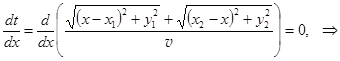 Время распространения света в среде 1 есть t 1 = AOçv 1, в среде 2 есть t 2 = OBçv 2, где v 1 и v 2 – скорость света в соответствующих средах. Из условия экстремальности времени следует: