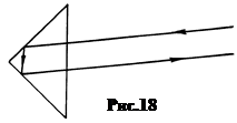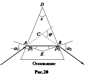 6. Преломление луча света, проходящего через призму. Пусть на одну грань призмы падает луч света, а из другой грани он выходит (рис.20). Угол между гранями e. Проходящий через призму луч в результате двукратного преломления на ее гранях отклоняется на угол j к основанию призмы. Угол отклонения j зависит от преломляющего угла призмы e и показателя преломления n вещества призмы.