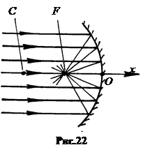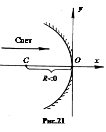 1. 2. Сферические вогнутые зеркала. Их важнейший геометрический параметр – радиус кривизны R. Для графического построения изображений сферическое зеркало (сегмент отражающей сферической поверхности) располагается в центре прямоугольной системы координат так, чтобы центр кривизны точка C находился на оси OX, а одна из точек поверхности – в начале системы координат в точке O (рис.21). Отражающая сторона зеркала располагается так, чтобы падающие на зеркало лучи шли в положительном направлении оси OX. Поскольку отражающая поверхность обладает осевой симметрией относительно оси OX, то для построений достаточно сечения зеркала координатной плоскостью XOY.