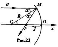 Все отрезки на оси OX, откладываемые вправо от точки O, имеют положительные значения. Аналогично, отрезки на оси OY положительны выше точки O и отрицательны ниже. Из этого правила знаков следует, что радиус кривизны вогнутого зеркала R - отрицательное число. 3. Найдем расстояние от вершины зеркала точки Пусть луч падает на зеркало в точку M. Угол a между падающим лучом и радиусом, проведенным в точку M, есть угол падения. По закону отражения угол FMC равен углу CMB. Так как падающий луч по условию параллелен главной оптической оси OX, то углы BMC и MCF равны как накрест лежащие. Следовательно, в треугольнике FMC углы MCF и FMC одинаковы. Треугольник FMC равнобедренный. Стороны MF и FC одинаковы. Если точку M устремить к главной оптической оси OX, то отрезок MF перейдет в пределе в отрезок OF. Отсюда следует, что отрезки OF и FC одинаковы.