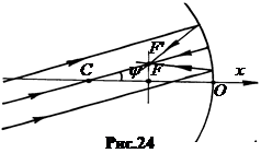 4. Фокальная плоскость. Пучок параллельных лучей, падающих на зеркало под углом y к главной оптической оси, после отражения также собирается в одной точке F', которая находится несколько в стороне от главного фокуса F (рис.24). При небольших углах y эта точка лежит в фокальной плоскости. Так называется плоскость, перпендикулярная главной оптической оси OX и проходящая через главный фокус F. Чтобы найти построением точку F', где соберется наклонный пучок, достаточно рассмотреть один луч, тот, что проходит через центр кривизны точку C. Тогда пересечение этого луча с фокальной плоскостью и есть точка F'. 5. Формула сферического зеркала. Пусть на главной оптической оси вогнутого зеркала находится светящаяся точка A 1. Лучи, испущенные точкой A 1, отразившись от зер-кала, пересекутся в точке A 2, находящейся на главной оптической оси (рис.25). Светящуюся точку A 1 называют предметом, а точку A 2– оптическим изображением точки A 1.