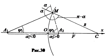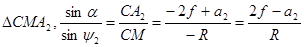 Найдем связь между тремя отрезками: расстоянием a 1 от вершины зеркала точки O до предмета A 1, расстоянием a 2 от вершины зеркала до изображения A 2 и фокусным расстоянием f. Поскольку все три отрезка с учетом принятого правила – отрицательные числа, то при записи соотношений в треугольниках будем записывать их со знаком «минус». Выделим один произвольный луч, идущий из точки предмета A 1, и после отражения от зеркала в точке M приходящего в точку изображения A 2 (рис.26).
