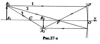 Разделив на произведение a 1 a 2 f, получаем: Это формула сферического зеркала, справедливая и с учетом правила знаков. 6. Построение изображений в вогнутом сферическом зеркале. Пусть точка предмета B 1 не лежит на главной оптической оси. Для построения ее оптического изображения применяют обычно 3 луча. Они дают возможность построить изображение любой точки, пользуясь лишь линейкой. Различают 3 случая: предмет находится от зеркала дальше центра кривизны точки C, предмет находится между центром кривизны точкой C и главным фокусом F и предмет находится между вершиной O и главным фокусом зеркала F. a. Предмет A 1 B 1 находится от зеркала дальше центра кривизны точки C (иногда говорят, дальше двойного фокуса, рис.27-а).
