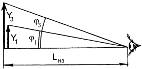 Здесь j 1 – угол, под которым невооруженный глаз видит предмет, расположенный на расстоянии наилучшего зрения от глаза, j 3 – угол, под которым глаз видит оптическое изображение в микроскопе (рис.69). Так как при наводке на резкость изображение Y 3 так же располагается на расстоянии наилучшего зрения L нз, то Видимое увеличение микроскопа равно его поперечному увеличению. При определении увеличений также учитывают правило знаков. Если поперечник предмета отрезок Y 1 (рис.68) считать положительным числом, то все отрезки, отсчитываемые от оптической оси в противоположную сторону, считаются отрицательными числами. При таком условии Y 2 и Y 3 – отрицательные числа. В практической работе с микроскопом удобнее все отрезки выражать положительными числами, а знак «минус» ставить заранее перед обозначением отрезка. В таком случае отрезки будут Y 1, – Y 2, – Y 3. С учетом правила знаков увеличение микроскопа определяется выражением Знак «минус» указывает, что изображение перевернутое. Очевидно,