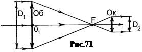 Угловое увеличение в трубе Кеплера Чтобы связать увеличение трубы Г с фокусными расстояниями объектива f об и окуляра f ок, рассмотрим ход лучей между линзами (рис.70). Так как изображение Y 2 находится практически в точке F об2 на расстоянии от объектива f об, то, как следует из треугольника В 2 О 1 F, 5.