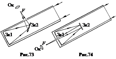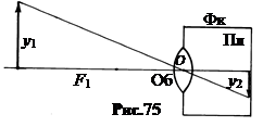 Крупнейший в настоящее время рефлектор имеет диаметр основного зеркала 6 м (Северный Кавказ, РФ). 9. Фото- и киноаппараты – приборы для получения оптических изображений на фоточувствительном слое пленки (рис.75). Основной их оптический элемент – объектив Об, представляющий собой многолинзовый анастигмат с устраненными аберрациями. Он смонтирован в специальной оправе и снабжен апертурной диафрагмой. Объектив представляет собой окно, через которое свет попадает в светонепроницаемую фотокамеру Фк. Для наводки на резкость изображения, то есть для совмещения плоскости изображения Y 2 с плоскостью фотопластинки Пл объектив может перемещаться вдоль главной оптической оси. 10. Проекционные приборы предназначены для получения изображений на экране в увеличенном виде с прозрачных пленок и рисунков на бумаге. Различают два типа таких приборов. Диаскопы (от греч. diaskopeo – внимательно смотрю) предназначены для проецирования прозрачных предметов. Эпископы (от греч. epi – приставка «над-») предназначены для проецирования непрозрачных предметов. Технически оба эти прибора часто объединяют в одном, называемом эпидиаскопом. Поскольку проекционные приборы дают увеличенное по сравнению с предметом изображение, то для обеспечения достаточной освещенности изображения на экране предмет надо сильно освещать. Поэтому кроме объективов проекционные приборы имеют еще один элемент – конденсор, концентрирующий свет от источника на предмете (конденсор – от лат. condenso – сгущаю).