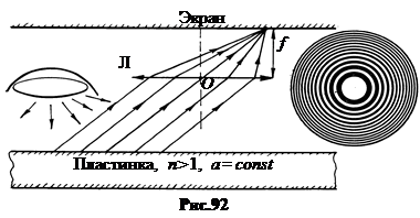Поскольку области одинаковых значений d располагаются по окружности вокруг центра линзы, то интерференционная картина представляет собой множество концентрических темных и светлых колец (рис.94-б). Кольца Ньютона есть интерференционные линии равной толщины.