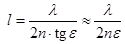 Оба луча 1 и 2 параллельны, когерентны (получены расщеплением падающего луча) и мало отличаются по интенсивности. Действительно, пусть коэффициент отражения света от границы раздела сред составляет 0,05 (5%). Полагаем, что интенсивность падающего в точку О луча равна I 0. Тогда интенсивность отраженного в точке О луча 1 равна I 1 = 0,05 I 0. Интенсивность прошедшего в пластину луча равна0,95 I 0. Пластинка тонкая и прозрачная, поэтому поглощением света в ней пренебрегаем. Интенсивность отраженного в точке С луча равна 0,05∙0,95 I 0, а интенсивность луча 2 I 0 = 0,95(0,05∙0,95 I 0) = 0,045 I 0. Отсюда разница в интенсивностях лучей 1 и 2 не превышает 10%. Вычислим разность хода лучей 1 и 2. Падающий луч расщепляется в точке О. Луч 1 сразу отражается, а луч 2 проходит внутрь пластинки. Наложение лучей происходит по прямой ЕВ. Луч 1 до наложения проходит отрезок ОЕ, а луч 2 – отрезок ОС + СВ. Но поскольку в средах с n > 1 длина волны l уменьшается в n раз, следует брать не геометрический, а оптический путь n (ОС + СВ). Кроме того, как установил Т. Юнг, при отражении от оптически более плотной среды свет теряет полволны, то есть луч как бы проходит дополнительный путь lç 2. В результате полная разность хода D между лучами 1 и 2 равна: Если а –толщина пластинки, то из геометрии рисунка получаем: