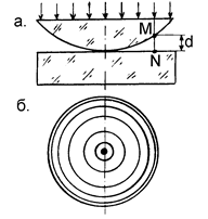 б. Кольца Ньютона – это интерференционная картина в виде системы концентрических светлых и темных колец. Наблюдается при нормальном освещении плосковыпуклой сферической линзы, помещенной выпуклой стороной на плоскую стеклянную пластину (рис.94-а). Впервые описана И. Ньютоном в 1675 г. Интерференция света происходит благодаря тонкому воздушному зазору между нижней поверхностью линзы и верхней поверхностью пластинки. Падающий сверху луч света на нижней поверхности линзы в точке М расщепляется. Часть луча отражается и идет вверх, другая часть проходит вниз, отражается от пластинки в точке N и также идет вверх. Выше точки М эти лучи накладываются друг на друга. Оптическая разность хода лучей D = 2 dn – lç 2, где d – ширина воздушного зазора, n – показатель преломления воздуха. В данном случае можно полагать n = 1. Член l/ 2 появляется в результате потери фазы (запаздывания) на p при отражении света от оптически более плотного слоя в оптически менее плотный (от стекла в воздух в точке N).