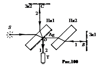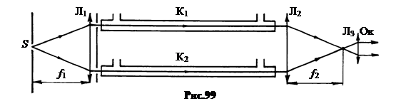б. Интерферометр Дж. Релея. Сконструирован в конце 19 века и используется в основном как рефрактометр. Взаимодействующие пучки выделяются с помощью двух щелевых диафрагм (рис.99). Пройдя кюветы К1 и К2, эти пучки собираются в фокальной плоскости линзы Л2, где образуется интерференционная картина полос равного наклона, рассматриваемая через окуляр Ок. Интерференционные рефрактометры относятся к числу наиболее чувствительных и точных приборов для измерения показателя преломления газов.
