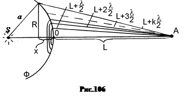 Пусть точечный источник S испускает монохроматическое излучение с длиной волны l. Волновой фронт Ф в однородной изотопной среде имеет в произвольный момент времени форму сферы радиуса а (рис.105). Спрашивается, почему наблюдатель, находящийся вне волнового фронта в точке А, не воспринимает всю сферу как светящуюся поверхность? Ведь в точку А должны приходить все вторичные волны от всех видимых точек сферы. 3. Метод зон Френеля. Для подсчета суммарного действия вторичных волн в произвольной точке А Френель предложил разбивать волновой фронт на кольцевые зоны (рис.106). Граница первой зоны очерчивается лучом из точки А длиной L + lç 2, внешняя граница второй зоны – лучом L + 2 lç 2, третьей зоны – лучом L + 3 lç 2 и так далее. Внешняя граница произвольной k -той зоны очерчивается лучом L + klç 2.