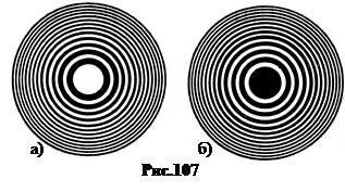 Шаровой сегмент высотой х и радиусом R, содержащий k зон имеет площадь 2p ах, где а – радиус сферы. Величина х найдется из условия При увеличении числа зон на одну их суммарная площадь увеличивается на одну и ту же величину Интенсивность I электромагнитной волны пропорциональна квадрату амплитуды вектора напряженности Е 0 электрического поля волны, I ~ Е 02. Поэтому подсчет суммарной интенсивности сводится к сложению амплитудных векторов Е 01, Е 02, Е 03 и так далее. Нечетные векторы направлены в одну сторону; а четные – в противоположную, поскольку волны от зон в точке А сдвинуты по фазе одна от другой на lç 2. Это вытекает из условия построения зон. С увеличением номера зоны проекция площади зоны, видимая из точки А, постепенно уменьшается. Уменьшается в точке А и модуль вектора Е 0. Поэтому Френель предложил записать сумму так: При постепенном убывании Е 0 суммы в скобках стремятся к нулю. Поэтому Действие всей волны в точке А сводится к половине действия центральной зоны. Вторичные волны от других участков волнового фронта, интерферируя, гасят друг друга. Радиус центральной зоны Распространение света от S к А происходит так, как если бы световой поток шел внутри очень узкого прямого канала вдоль оси SA. Этот вывод и есть объяснение прямолинейного распространения света в волновой теории. 4. Зонная пластинка. Если изготовить такую пластинку, на которой нанесены концентрические круговые полосы, закрывающие четные или нечетные зоны Френеля, то лучи от открытых зон будут усиливать друг друга. В результате такой экран, называемый зонной пластинкой (Соре, 1875), увеличивает освещенность в точке А, действуя подобно собирающей линзе. Зонные пластинки можно изготовить, сфотографировав интерференционную картину колец Ньютона в отраженных (рис.107-а) или в проходящих лучах (рис.107-б).