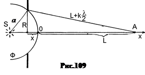 Самый дальний фокус находится в точке, из которой вся пластинка закрывается центральной зоной. Дальше интенсивность света непрерывно убывает по закону удаления от точечного источника. Роберт Вуд изготовил пластинку, в которой непрозрачные кольца заменил также прозрачными, но так, что оптическая длина четных зон отличается от оптической длины нечётных зон на l/ 2. Поэтому свет от четных зон приходит в той же фазе, что и от нечетных. Такая пластина собирает весь падающий на нее свет. Пластинка Соре создает повышенную интенсивность в фокусах А 0, А 1… путем деления волнового фронта. Пластинка Вуда кроме деления волнового фронта создает еще и сдвиг по фазе у четных или нечетных вторичных волн. Поэтому пластинку Вуда называют часто фазовой зонной пластинкой. 5. Дифракция на круглом отверстии. Пусть в непрозрачной стенке есть круглое отверстие радиуса R. На оси отверстия слева находится точечный источник S, излучающий монохроматический свет с длиной волны l (рис.109). Часть световых волн проходит сквозь отверстие и распространяется вдоль оси ОХ. Спрашивается, что должно наблюдаться – свет или темнота в точке А, расположенной на оси отверстия в сторону от источника S. Для ответа на этот вопрос достаточно определить, четное или нечетное число зон укладывается на фронте волны Ф в пределах отверстия. При четном числе зон в точке А – темнота, при нечетном – свет. 6. Пренебрегая членами, содержащими квадраты малых величин х и l, исключив х и разрешив систему относительно L, находим положение точки А, из которой на отверстии укладывается k зон Френеля.