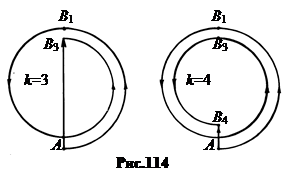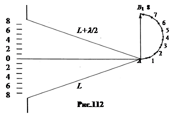 Таким образом, действие первой (центральной) зоны представляется вектором АВ 1, который является суммой восьми векторов 1, 2, 3,… 8. Если разбить зону на бесконечно большое число бесконечно малых участков, то ломаная линия превращается в кривую, которая очень мало отличается от полуокружности. Чтобы учесть действие второй зоны, надо продолжить векторную диаграмму. Тогда мы получим вторую дугу, хорда которой В 1 В 2 чуть меньше, чем у дуги АВ 1 вследствие возрастающего наклона зоны (рис.113-а).