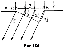 Если на решетку падает волновой фронт, то интерферируют не только вторичные волны, идущие от разных точек одной щели, но и волны, идущие от соответственных (одинаково расположенных) точек разных щелей (рис.130). Закономерности интерференции вторичных волн на N щелях можно сформулировать в виде трех выводов. а. Если решетка находится от линзы на расстоянии L >> Nd, где N – число щелей решетки, d – ее период, то интерференционные картины от одиночных щелей просто накладываются одна на другую. Интенсивность света в каждой точке интерференционной картины от одной щели в случае решетки увеличивалась в N раз.