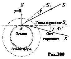 3. Астрономическая рефракция была известна уже во времена Птолемея (2 в. н.э.). В 1604 г. И. Кеплер предположил, что земная атмосфера имеет независимую от высоты плотность и определённую толщину h (рис.199). Луч 1, идущий от звёзды S прямо к наблюдателю A по прямой, не попадёт в его глаз. Преломившись на границе вакуума и атмосферы, он попадёт в точку В. В глаз наблюдателя попадёт луч 2, который при отсутствии преломления в атмосфере должен был бы пройти мимо. В результате преломления (рефракции) наблюдатель будет видеть звезду не в направлении S, а на продолжении преломлённого в атмосфере луча, то есть в направлении S 1. Угол γ, на который отклоняется к зениту Z видимое положение звезды S 1 по сравнению с истинным положением S, называют углом рефракции. Во времена Кеплера углы рефракции были уже известны по результатам астрономических наблюдений некоторых звёзд. Поэтому данную схему Кеплер использовал для оценки толщины атмосферы h. По его вычислениям получилось h» 4 км. Если считать по массе атмосферы, то это примерно в два раза меньше истинного. В действительности плотность атмосферы Земли уменьшается с высотой. Поэтому нижние слои воздуха оптически плотнее, чем верхние. Лучи света, идущие наклонно к Земле, преломляются не в одной точке границы вакуума и атмосферы, как в схеме Кеплера, а искривляются постепенно на всём протяжении пути. Это подобно тому, как проходит луч света через стопу прозрачных пластинок, показатель преломления которых тем больше, чем ниже расположена пластинка. Однако суммарный эффект рефракции проявляется так же, как и в схеме Кеплера. Отметим два явления, обусловленные астрономической рефракцией.