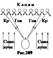 По-видимому, именно такой мираж представляет собой легендарные “Летучие голландцы” - призраки кораблей, находящихся в действительности на расстоянии в сотни и даже тысячи километров. Удивительно в верхних миражах то, что не наблюдается заметного уменьшения видимых размеров тел. Например, в 1898 г. экипаж бременского судна “Матадор” наблюдал судно-призрак, видимые размеры которого соответствовали расстоянию 3-5 миль. В действительности, как позднее выяснилось, это судно находилось в это время на расстоянии около тысячи миль. (1 морская миля равна 1852 м). Приземный воздух не только искривляет световые лучи, но и фокусирует их как сложная оптическая система. В обычных условиях температура воздуха с увеличением высоты падает. Обратный ход температуры, когда с увеличением высоты температура растёт, называют инверсией температуры. Температурные инверсии могут возникать не только в арктических зонах, но и в других, более низких по широте местах. Поэтому верхние миражи могут возникать всюду, где воздух достаточно чист и где возникают температурные инверсии. Например, миражи дальнего видения наблюдаются иногда на побережье Средиземного моря. Инверсия температуры создаётся здесь горячим воздухом из Сахары. б. Нижний мираж возникает при обратном ходе температуры и наблюдается обычно в пустынях в жаркое время. К полудню, когда солнце высоко, песчаный грунт пустыни, состоящий из частиц твёрдых минералов, разогревается до 50 и более градусов. В то же время на высоте нескольких десятков метров воздух остаётся сравнительно холодным. Поэтому коэффициент преломления выше расположенных слоёв воздуха оказывается заметно больше по сравнению с воздухом возле земли. Это также приводит к искривлению лучей, но в обратную сторону (рис.203).