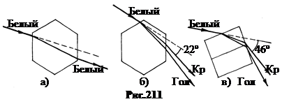 Снежинки, падающие на землю, очень разнообразны по форме. Однако кристаллики, образующиеся в результате конденсации паров в верхних слоях атмосферы, имеют, в основном, форму шестигранных призм. Из всех возможных вариантов прохождения луча через шестигранную призму наиболее важны три (рис.211). В случае (а) луч проходит через противоположные парал-лельные грани призмы, не расщепляясь и не отклоняясь. В случае (б) луч проходит через грани призмы, образующие между собой угол 60º, и преломляется как в спектральной призме. Интенсивность луча, выходящего под углом наименьшего отклонения 22º, максимальна. В третьем случае (в) луч проходит через боковую грань и основание призмы. Преломляющий угол 90º, угол наименьшего отклонения 46º. В обоих последних случаях белые лучи расщепляются, голубые лучи отклоняются больше, красные – меньше. Обычно наружное кольцо (46º) ярче внутреннего и оба они имеют красноватый оттенок. Это объясняется не только интенсивным рассеиванием голубых лучей в облаке, но и тем, что дисперсия голубых лучей в призме больше, чем красных. Поэтому голубые лучи выходят из кристаллов сильно расходящимся пучком, из-за чего их интенсивность уменьшается. А красные лучи выходят узким пучком, имеющим значительно большую интенсивность. При благоприятных условиях, когда удаётся различать цвета, внутренняя часть колец красная, внешняя – голубая. 10. Венцы – светлые туманные кольца вокруг диска светила. Их угловой радиус много меньше радиуса гало и не превышает 5º. Венцы возникают вследствие дифракционного рассеяния лучей на образующих облако или туман водяных каплях. Если радиус капли R, то первый дифракционный минимум в параллельных лучах наблюдается под углом j = 0,61∙ lçR (см. формулу 15.3). Здесь l - длина волны света. Дифракционные картины отдельных капель в параллельных лучах совпадают, в результате интенсивность светлых колец усиливается. По диаметру венцов можно определять размер капель в облаке. Чем крупнее капли (больше R), тем меньше угловой размер кольца. Самые большие кольца наблюдаются от самых мелких капель. На расстояниях несколько километров дифракционные кольца ещё заметны, когда размер капель не менее 5 мкм. В этом случае j max = 0,61 lçR ≈ 5 ¸ 6°. Окраска светлых колец венцов проявляется очень слабо. Когда она заметна, то наружный край колец имеет красноватый цвет. То есть распределение цветов в венцах обратно распределению цветов в кольцах гало. Помимо угловых размеров это также позволяет различать венцы и гало между собой. Если в атмосфере присутствуют капли широкого спектра размеров, то кольца венцов, налагаясь друг на друга, образуют общее светлое сияние вокруг диска светила. Это сияние называют ореолом. 11. Голубой цвет неба и алый цвет зари. Когда Солнце находится выше горизонта, безоблачное небо видится голубым. Дело в том, что из лучей солнечного спектра в соответствии с законом Рэлея I расс ~ 1 /l 4 наиболее интенсивно рассеиваются короткие синие, голубые и фиолетовые лучи. Если Солнце находится низко над горизонтом, то его диск воспринимается багрово-красным по этой же причине. Благодаря интенсивному рассеянию коротковолнового света до наблюдателя доходят, в основном, слабо рассеивающиеся красные лучи. Рассеяние лучей от восходящего или заходящего Солнца особенно велико ещё потому, что лучи проходят большое расстояние в