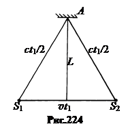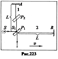 Пусть плечо А перпендикулярно к скорости эфирного ветра v (рис.223). Движение упругой световой волны в эфире, относительно которого движется Земля, будет происходить не по пути 2 L, а по ломаной S 1 AS 2 (рис.224). Время движения t 1 светового импульса от точки S 1 пластинки P 1 до зеркала А и обратно найдётся из условия: