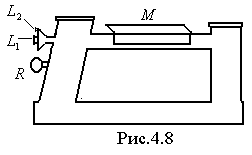 Рис.4.7 Из формулы 4.8 Итак, для нахождения концентрации раствора сахара достаточно измерить угол вращения плоскости колебаний луча света, проходящего через слой этого раствора определенной толщины. Кроме того, необходимо знать значение постоянной прибора. В данной работе используется прибор называемый сахариметром (рис.4.8). Его основные части два николя I и II, расположенные в металлической трубке, поддерживаемой штативом. На николь I падает естественный луч света от источника. Поляризованный луч света падает на николь II, который может поворачиваться при помощи винта R вокруг оси прибора. Углы поворота николя II отсчитываются при помощи нониуса по разделенному градусному лимбу. Добиться полного перекрещивания николей по наблюдениям изменения интенсивности прошедшего через них света очень трудно. Поэтому для повышения точности наблюдений в поляриметр вводятся добавочные оптические части. Поле зрения в таком приборе кажется разделенным на две половины.