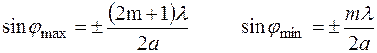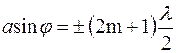 Рассмотрим дифракцию Фраунгофера плоской монохроматической волны на одной бесконечно длинной щели шириной a = MN. Оптическая разность хода между крайними лучами МС и ND (см. рисунок): Δ = NF = asinφ Разобьем открытую часть волновой поверхности MN на зоны Френеля, параллельные ребру М щели. Ширина каждой зоны выбирается так, чтобы разность хода от краев этих зон была равна λ/2, поэтому на ширине щели уместится Все точки волнового фронта в плоскости щели имеют одинаковую фазу и амплитуду колебаний. Поэтому суммарная интенсивность колебаний от двух любых соседних зон Френеля равна нулю. Следовательно: 1) если число зон Френеля четное, то: — условие дифракционного минимума (полная темнота) 2) если число зон Френеля нечетное, то — условие дифракционного максимума, соответствующего действию одной некомпенсированной зоны Френеля. В направлении φ = 0 щель действует как одна зона Френеля и в этом направлении свет распространяется с наибольшей интенсивностью — центральный дифракционный максимум. Направления, в которых амплитуда максимальна или равна нулю: