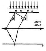 Разности хода Δ лучей, идущих от двух соседних щелей, будут для данного направления φ одинаковы в пределах всей дифракционной решетки: Δ = CF = (a + b) sin φ = d sin φ. Очевидно, что в тех направлениях, в которых ни одно из щелей не распространяет свет, он не будет распространяться и при двух щелях, т.е. прежниiе (главные) минимумы интенсивности будут наблюдаться в направлениях a sin φ=mλ (т = 1,2,3, ...). Кроме того, вследствие взаимной интерференции, в направлениях, определяемых условием d sin φ = ±(2m + 1) λ/2 световые лучи, посылаемые двумя соседними щелями, будут гасить друг друга — возникнут дополнительные минимумы. Наоборот, действие одной щели будет усиливать действие другой, если d sin φ = ±2m λ/2 (m = 1,2,3,...) — условие главных максимумов. В обшем случае, если дифракционная решетка состоит из N щелей, то: • условие главных максимумов: d sin φ = ±m λ/2 (m = 1,2,3,...) • условие главных минимумов: a sin φ = ±m λ/2 (m = 1,2,3,...) • между двумя главными максимумами располагается N-1 дополнительных минимумов, разделенных вторичными максимумами, создающими слабый фон. Условие дополнительных минимумов: Амплитуда главного максимума есть сумма амплитуд колебаний от каждой щели Аmax = NA1. Поэтому, интенсивность главного максимума в N2 раз больше интенсивности I1, создаваемой одной щелью в направлении главного максимума: Imax = N2I1.