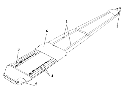 Чехол изготовлен из ткани (перкаля или капрона) оранжевого цвета, имеет форму рукава длиной 5,28 м и надевается на всю длину уложенного купола. По всей длине чехла нашиты усилительные ленты (1), которые в верхней его части образуют уздечку (2) для присоединения вытяжной веревки. В нижней части чехол имеет одну пару двойных съемных сот (3) и одиннадцать пар несъемных сот (4) для укладки строп и заканчивается фартуком (5) с двумя окнами. Над каждым окном имеется карман для укладки в него пучка строп. Пучки строп, вложенные в двойные съемные соты, зачековывают нижнюю часть чехла и препятствуют преждевременному выходу купола из чехла. Уложенные в соты пучки строп закрываются предохранителем строп (6), который защищает их от зацепления и преждевременного выдувания из сот воздушным потоком. Рис. 11 Вытяжной трос предназначен для удержания в закрытом положении клапанов ранца. Он имеет три шпильки на одном конце, а на другом - петлю, с помощью которой соединяется с петлей вытяжной веревки. Вытяжной трос протянут через предохранительный чехол, который защищает обшивку самолета от возможных повреждений его шпильками после раскрытия ранца парашюта.