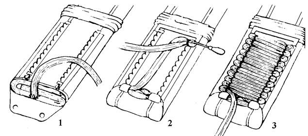 После зачековки фартука стропами, т.е. после укладки строп в двойные соты, продолжить укладку строп, начиная с самой верхней пары сот (2). По мере укладки строп в соты, подвесную систему подтягивать к куполу. В процессе укладки не допускается перекручивание строп. Укладка строп завершается у второго ряда черных меток на стропах (3). После окончания укладки строп в соты чехла необходимо вынуть укладочную рамку и закрыть стропы предохранителем. Проверяющий осматривает качество укладки строп, при этом обращает внимание на то, чтобы не были пропущены соты, не было излишней слабины строп, чтобы стропы не были перекручены. На этом заканчивается третий этап укладки парашюта.