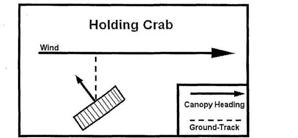 Теперь измените направление своего полета еще на 45 градусов, чтобы находится перпендикулярно направлению ветра. Такое положение можно назвать «полным сползанием». Если вы обратите свое внимание на курс, то заметите, что передвигаетесь над поверхностью земли с большей скоростью, чем при фиксированном сносе. Теперь вы двигаетесь под углом 45 градусов к курсу полета купола по ветру и со скоростью ветра, в данном случае - 20 миль в час. Ваша воздушная скорость перемещает вас правее. Применительно к сравнению с лодкой, вы пересекаете реку, но постепенно смещаетесь по направлению ее течения со скоростью реки.