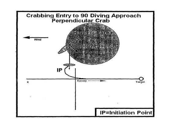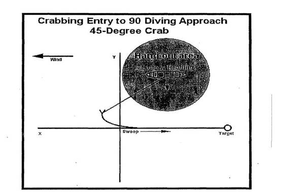 Понимание этой схемы очень важно, если вы хотите выполнить «свуп» в задуманном месте. Чтобы это произошло, вы должны грамотно управлять куполом и привести его в начальную точку на правильной высоте. Хорошие «свупы» удаются и срываются на высоте 1000 футов над землей. Если вы не оказались в нужном месте в нужное время, вы не сможете выполнить «свуп» там, где планировали. Лучший способ попасть в начальную точку - эффективное и сознательное изменение курса. Если вы будете размышлять, в какую сторону направить купол, вы слишком перенервничаете к тому моменту, когда надо начинать поворот. Далее, если вы опоздаете к месту начала, вам не хватит высоты для маневра. Своевременность выхода на контрольную точку проверки высоты зависит, в основном, от вашего понимания таких понятий, как пробег, зависание и сползание. Самый важный аспект навигации, относящийся к «свупам», это путь к цели. Как мы уже отмечали, пробег вызывает увеличение путевой скорости (скорости относительно земли). Это приводит к смещению схемы вхождения в поворот, о чем я говорил выше. «Сползание» также играет важную роль, и может существенно повлиять на всю схему полета. Когда вы готовитесь к «нырку», очень важно использовать «holding crab". Направляя купол против ветра по мере того, как вы «сползаете» по линии ветра, вы существенно уменьшите путевую скорость. Это немного замедлит весь процесс, и вас появится время, чтобы принять правильное решение. При использовании принципа снижения путевой скорости, у пилота есть возможность оставаться близко к точке начала. Кроме того, оставаясь в точке немного против ветра по отношению к месту начала поворота, вам потребуется меньше времени и высоты, чтобы приблизиться к этому месту, когда вы достигните нужной высоты. Ветер - как река. Бороться с течением - просто терять время и силы. Давайте рассмотрим подробнее, как ветер влияет на высокоскоростные заходы, на примере поворота на 90 градусов. Повороты на 180 и 270 градусов развиваются по такому же принципу. При большом ветре очень важно, чтобы вы оставались против ветра к точке поворота, пока вы ждете нужной высоты. Есть два варианта подхода к начальной точке в ветреный день. Первый — выбрать направление под углом 90 градусов к линии ветра, и позволить ветру «отнести» вас к месту начала маневра. Такое метод называется «сползанием на 45 градусов» и включает диагональное скольжение к точке вашего пересечения с направлением до цели. Преимущество такого захода к месту начала маневра «по-крабьи» в том, что нет необходимости в изменении направления полета купола перед началом «нырка». Недостаток заключается в том, что такой способ навигации требует понимания углов «сползания» и тщательной предварительной подготовки.