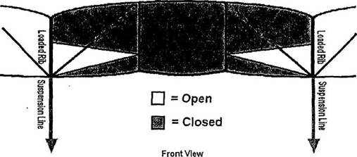 Однако существует проблема. При добавлении всех этих воображаемых «прикреплений» к стропам, купол выходит из камеры и сразу же становится плоским. В сочетании тканью нулевой проницаемости это может сделать раскрытие таким резким, что вы прикусите язык, как это произошло с одним испытателем. Надо было что-то придумать, прежде, чем выпускать ZP на рынок. Инженер из Новой Зеландии нашел решение: он просто закрыл/сомкнул центральную секцию трех-секционника. Это замедлило скорость наполнения купола воздухом и сделало раскрытия спокойнее. Понемногу он закрывал/смыкал нос купола до тех пор, пока раскрытия не стали достаточно медленными. Но, как это бывает в жизни, он зашел слишком далеко. Парашют