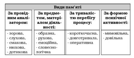 Пам'ять - багатий у своїх проявах пізнавальний процес, тому наука нараховує декілька класифікацій видів пам'яті, здійснених за різними ознаками. Залежно від того, що саме людина запам'ятовує і відтворює, розрізняють чотири види пам'яті: образну, рухову, емоційну і словесно-логічну.