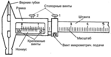 Если верхняя шкала – масштаб с ценой деления 1 мм, то нижняя шкала – нониус – строиться так, что на отрезок 9мм приходится 10 делений нониуса. В результате цена деления нониуса составляет 0,9мм. Поэтому, если нулевой штрих нониуса (крайний левый) совпадает с нулевым штрихом масштаба, то первые штрихи масштаба и нониуса отстоят друг от друга на расстоянии 1мм-0,9мм=0,1мм. Вторые – на расстоянии 0,2мм, третьи – 0,3мм и т.д. Если рамку сдвинуть вправо на 0,1мм, то первые штрихи совпадут, а между губками образуется расстояние 0,1мм. Если же рамку сдвинуть на 0,2мм, то совпадут уже вторые штрихи и т.д. Таким образом, номер штриха нониуса, совпадающего со штрихом масштаба, показывает число десятых долей миллиметра. Ситуация не меняется, если отсчет ведется не от нулевого штриха масштаба, а от любого его деления. Минимальный шаг прибора с нониусом называется точностью нониуса. В рассмотренных примерах точность нониуса 0,1мм. Точность нониуса определяется отношением минимального деления шкалы масштаба к числу делений нониуса. В данном случае 1мм/10дел.=0,1мм. Существуют штангенциркули, у которых в нониусе 20 делений. При миллиметровой шкале масштаба точность таких нониусов составляет 1мм/20дел.=0,05мм Существуют штангенциркули, у которых общая длина нониуса не 9мм, а больше, обычно 19мм. В этом случае при 10 делениях в нониусе цена деления нониуса составляет 1,9мм. Точность нониуса здесь определяется также отношением цены деления масштаба к числу делений нониуса, т.е. в данном случае – 0,1мм. Такие растянутые нониусы удобнее в работе, поскольку их штрихи расположены дальше друг от друга, что облегчает отсчет. Измерение штангенциркулем состоит из нескольких этапов. а) Проверка установки нониуса. Губки штангенциркуля сводятся вместе до упора, после чего нужно выяснить, совпадают ли нулевые штрихи масштаба и нониуса. Если совпадения нет, с помощью отвертки следует ослабить крепежные винты, удерживающие пластинку с нониусом, установить нониус так, чтобы его нулевой штрих максимально точно совпадал с нулевым штрихом масштаба (рис.6), и затянуть винты. б) Определение точности нониуса. Выясняется цена деления шкалы масштаба, то есть расстояние между ее любыми соседними штрихами, и делится на число делений нониуса. Все выпускаемые сейчас в России штангенциркули имеют точность нониуса 0,1 или 0,05мм. в) Измерение. Объект зажимается между губками, после чего затягивается стопорный винт 1. С помощью микрометрического винта губки дожимаются так, чтобы объект извлекался с некоторым усилием. Чтобы рамка случайно не сдвинулась, стопорится винт 2. При последующем измерении этот винт ослабляется. г) Отсчет. Вначале определяется количество целых миллиметров по шкале масштаба, затем – число десятых или сотых по нониусу. Результат измерения записывается в миллиметрах. Если ноль нониуса установлен максимально точно, а измерение выполнено достаточно аккуратно, то максимальная абсолютная погрешность единичного измерения штангенциркуля равна половине точности нониуса, допускаемой при установке нуля, плюс половине точности нониуса при отсчете. В целом абсолютная погрешность измерения штангенциркулем равна половине точности нониуса.